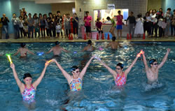 先生たちが登場すると子どもたちも保護者の方も手拍子で盛り上げてくれました。普段は明るいプールですが、照明が消えると会場は「ざわざわ、、」。様々な色のライトを使って幻想的なショーを行ないました。子どもたちからは「かっこいい!」「きれい!」という声が上がっていました。最後は拍手喝采、大成功でした。 |